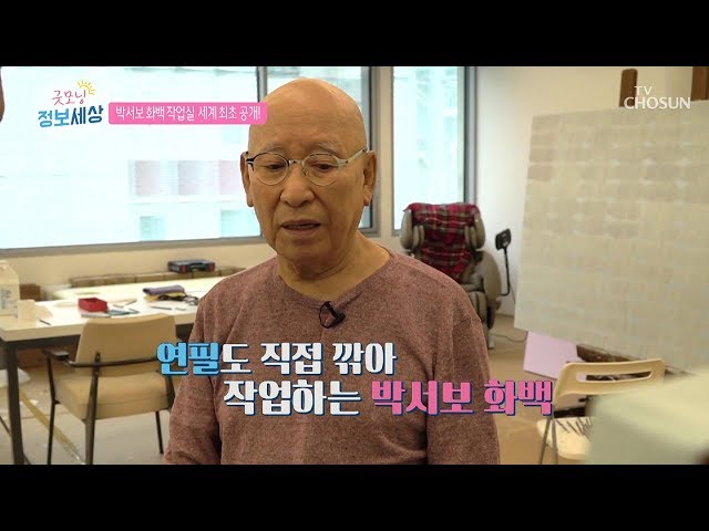 1977년 합정동 집 주차장을 개조해서 쓴 작업실에서 박서보가 알루미늄 사다리를 개조해서 만든 작업대 위에 앉아 흰색 유화물감을 바른 캔버스 위에 연필로 선을 그으며 '묘법' 작업 중이다.